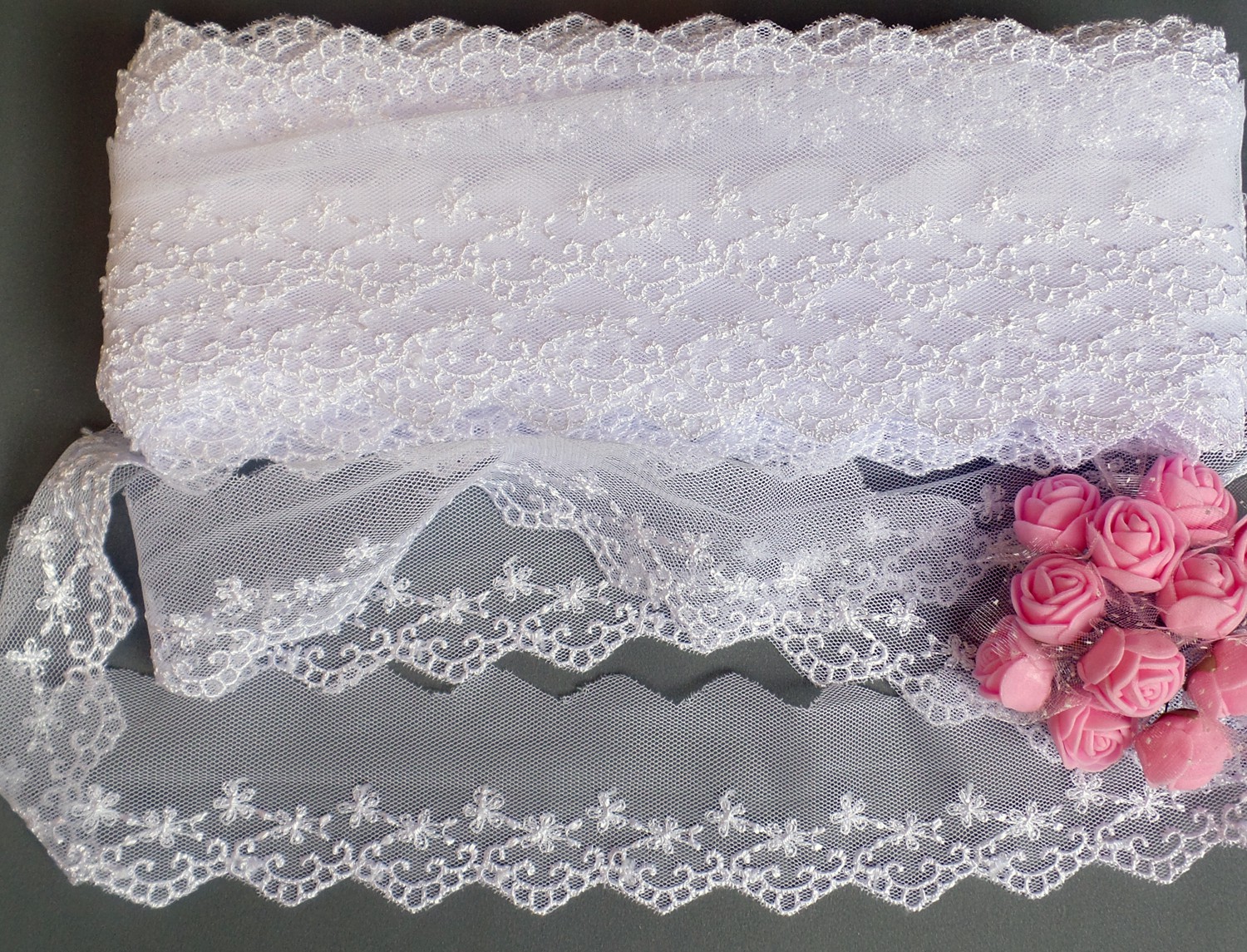 BT007 - 4,50cm x 13,70m | Renda Tule Bordado 100% Poliéster Branco