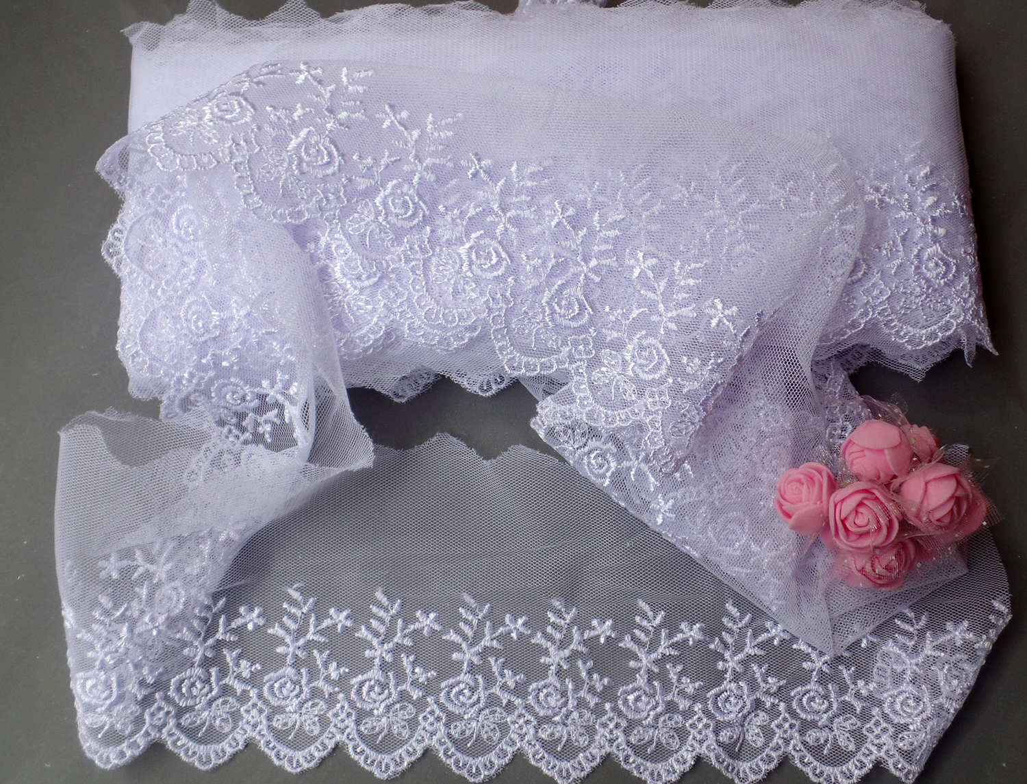 Linda Renda em Tule Floral Bordado em 100% poliéster branco. A renda em tule bordado tem todo aquele charme na transparencia da peça e é ideal para confeção de enxoval de bebê, decoração e no vestuário.